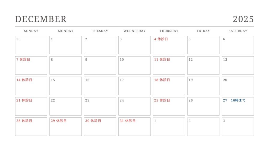 Home 2025年12月の診療日 2025年12月1日 1年を通してみなさまに支えて頂き、心より感謝申し上げます。 12月は一年の締めくくり。慌ただしい日々のなかで、ご自身のケアはつい後回しになりがちです。 今年もたくさん笑って、たくさんおいしいものを楽しんだお口の中を、いちど整えてあげませんか? 小さな違和感でも、放っておくと、年末年始に痛みが出てしまうこともあります。 どうぞ無理のないタイミングでご相談ください。気持ちよく新年を迎えられるよう、お手伝いします。 ヒカリノデンタルクリニック 院長 石井宏明